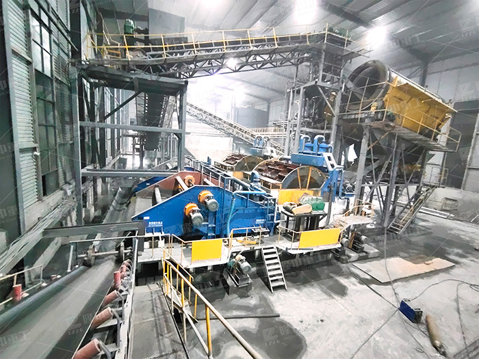 物料先經過擦洗機進行擦洗,除去砂顆粒表面附著的泥粉;擦洗后的物料進入輪洗洗砂機進行二次清洗、控水,達到泥沙分離效果,最后清洗后的粗、細砂進入脫水篩進行脫水,因此實現高效洗砂。