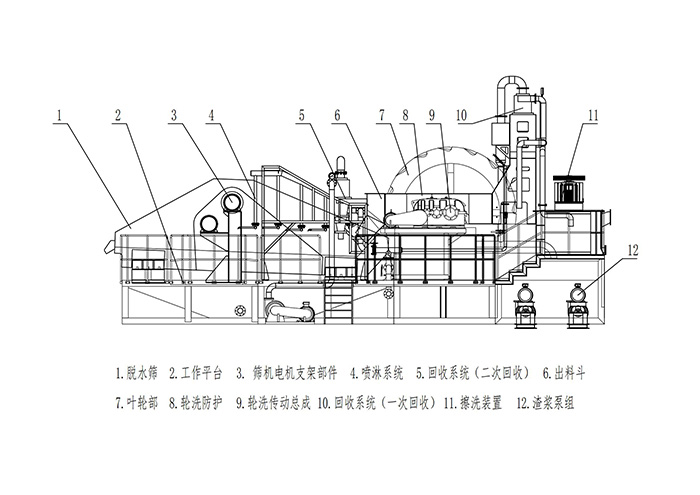 將傳統(tǒng)擦洗機與輪式洗砂機相結(jié)合,能夠使物料與物料充分摩擦去除表面附著物,同時采用高速旋轉(zhuǎn)的攪拌軸,使清洗效果顯著提高。